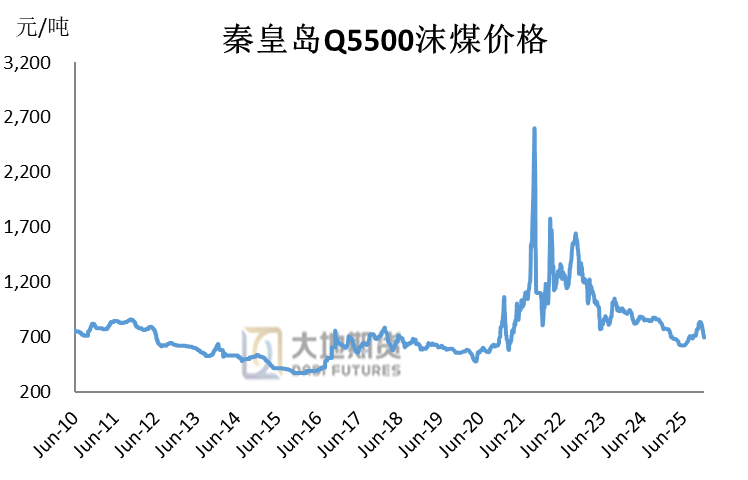 数据来源:大地期货研究院 6、2025年至今:供需宽松下的价格弱势震荡 步入2025年,煤炭市场延续着前期的供需宽松格局,价格也在供应过剩、需求不振的双重困境下,一度弱势下跌。供应方面,在全球能源市场竞争加剧的背景下,国际动力煤价格持续走低,一度跌至80美元/吨以下,这使得国内动力煤在价格上失去了竞争力。大量低价进口动力煤涌入国内市场,进一步挤压了国内动力煤企业的生存空间。在需求方面,随着清洁能源的快速发展,水电、风电、光伏等新能源在能源消费结构中的占比不断提高,对动力煤的替代作用日益明显。许多地区的电力企业纷纷加大对新能源发电的投入,减少了对火电的依赖,动力煤的需求进一步受到抑制。在供应过剩、需求不振的双重影响下,动力煤市场陷入了价格弱势震荡的困境。2025年7-9月,国内“反内卷”政策与”查超产“措施限制供应弹性叠加迎峰度夏的需求旺季,煤价触底反弹并快速抬升。10-11月,安监升级叠加冷冬预期,煤价震荡上行至高位。11月末至12月,前期因安全及环保检查暂停的民营煤矿陆续恢复生产,而需求端虽然步入传统供暖旺季,但冷空气影响范围与强度有限,终端电力需求复苏乏力,煤价年末加速探底。