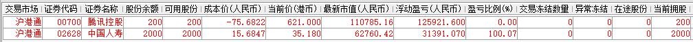 | 账户初始资金:100000.00元 2015年5月18日入金:32000.00元 2015年5月29日入金:9000.00元 2015年6月23日入金:20000.00元 2015年6月26日入金:10000.00元 2015年6月29日入金:20000.00元 2015年7月3日入金:20000.00元 2015年7月8日入金:10000.00元 2016年1月12日入金:90000.00元 2016年1月22日入金:100000.00元 2016年1月27日入金:100000.00元 2016年3月21日出金:270000.00元 2016年4月12日出金:35639.23元 2016年0月10日出金:56913.08元 2016年10月28日入金:60000.00元 2017年3月7日出金:113800.00元 参考市值:192821.58元 账户资产:193225.49元 截至今日账户A股盈亏:-43343.36元 截至今日账户港股盈亏:152245.25元 账户净值:2.163 资金股份