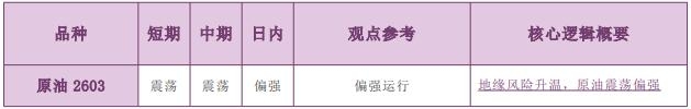 备注: 1.有夜盘的品种以夜盘收盘价为起始价格,无夜盘的品种以昨日收盘价为起始价格,当日日盘收盘价为终点价格,计算涨跌幅度。 2.跌幅大于 1%为弱势,跌幅 0~1%为偏弱,涨幅 0~1%为偏强,涨幅大于1%为强势。 3.偏强/偏弱只针对日内观点,短期和中期不做区分。 主要品种价格行情驱动逻辑—商品期货能源化工板块 原油(SC) 日内观点:偏强 中期观点:震荡 参考观点:偏强运行 核心逻辑:近期美国总统特朗普频繁释放地缘风险信号,格陵兰岛、加拿大或成为美国下一个夺取和打击的目标。由于短期美军航母达到中东战场,伊朗发表强硬言论,美伊可能爆发新一轮军事冲突,或威胁中东原油外运,地缘风险再度增强。随着地缘风险情绪盖过油市偏弱的供需基本面,提振本周三夜盘国内外原油期货价格迎来小幅上涨的走势,预计本周四国内原油期货或维持震荡偏强的走势。 责任编辑:七禾小编 |