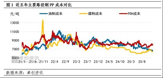 | 【导语】当前PP市场已迈入完全竞争与低估值阶段,成本成为市场定价的核心锚点。近五年各工艺路线成本同比均有下滑,对PP成本端支撑走弱。煤制PP凭借显著的成本优势成为决定PP价格底线的核心力量。本文将聚焦油制、煤制、PDH 制三大主流生产路径,解析其成本利润差异及市场影响。 原料价格整体走低 成本端支撑走弱 伴随供需矛盾持续加剧,当前PP市场已迈入完全竞争阶段。值得关注的是,成本端的支撑逻辑已经发生根本性改变:区别于传统各路径成本给PP带来的强支撑,由于当前原油、煤炭等价格陆续走低,压制业者心态的同时也大幅弱化了成本对PP 市场的支撑作用。 成本结构分化 盈利困境与优势并现 从成本结构特点来看,三大主要路径也各有差异:油制PP高度依赖国际油价,整体工艺虽然成熟但弹性不足,无原料替代空间,因而当油价持续高位波动时,油制PP便丧失成本竞争力。2025年油制PP年均成本达7380.53元/吨,同比下滑11.82%。而与之相似的是PDH制PP,因其原料丙烷进口依赖度高,容易受到地缘政治、关税政策、物流成本等多方面制约,因而PDH 制 PP也容易陷入高成本困境。2025年PDH制PP年均成本在7945.51元/吨,同比下滑2.44%。综合比较之下,煤制PP成本优势更为明显,受益于国内煤炭价格低位及供应相对稳定,煤制PP成本持续处于低位。2025年煤制PP年均成本在6346.04元/吨,同比下滑13.22%。