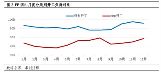 可见虽不同路径制PP成本均有不同程度的下滑,但煤制PP成本仍处于成本路线最低端。从利润水平方面来看,煤制PP毛利表现依旧相对较好。2025年煤制PP平均毛利为336.89元/吨,除此之外,其余各路径制PP毛利水平均为负值。油制PP毛利为-354.93元/吨,PDH制PP毛利在-899.15元/吨。同时结合PP开工负荷来看,2025年煤制PP生产企业凭借成本改善尚能保持高开工运行,开工水平基本维持在90%左右,而PDH制PP企业则因亏损严重陷入频繁停车的不良循环,开工水平多在70%-80%左右。