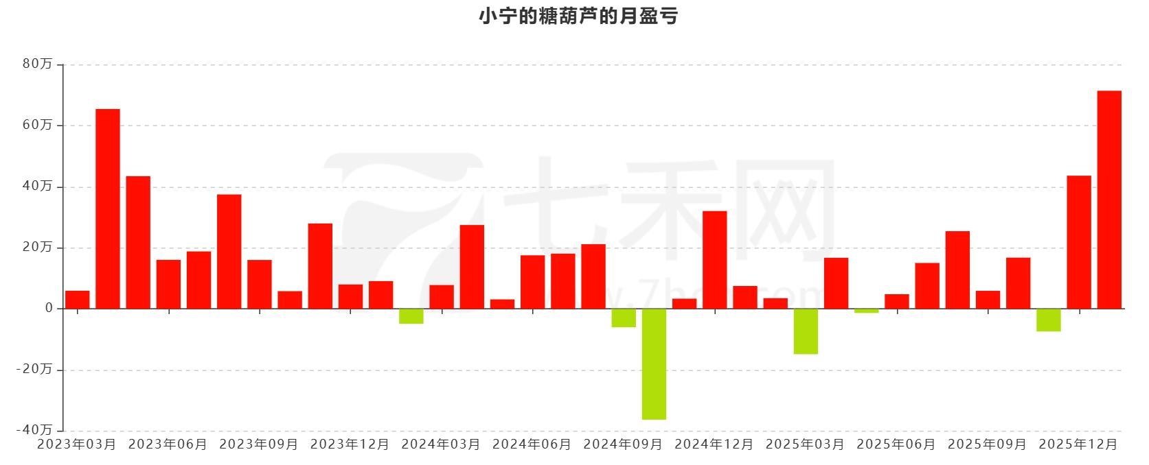 从月盈亏图来看,账户“小宁的糖葫芦”共计交易35个月的时间,盈利29个月,亏损6个月。