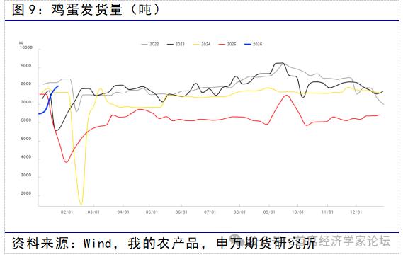 2、鸡蛋 回顾1月鸡蛋市场,可以用“节前冲高、动能见顶”来概括。在春节备货的强劲驱动下,现货价格走出一轮显著上涨行情,养殖利润也大幅修复。然而,这波上涨的根基并非来自长期供需结构的扭转,而是典型的节日效应。一方面,需求虽然集中释放,但月末贸易商心态已转为谨慎,对高价开始抵触;另一方面,在产存栏虽有小幅下降,但补栏积极性已随着盈利好转而回升,这为未来埋下了供应隐患。 根据我的农产品数据显示,在产蛋鸡存栏量:12.88亿只,环比下降0.54%,但同比仍增长5.31%。鸡苗销量:3918万羽,环比增加5.18%,反映养殖端补栏积极性回升。老母鸡出栏量:290.07万只,环比减少1.33%;但老母鸡屠宰量1007.92万只,环比大幅增加12.54%。 展望后市,市场逻辑将发生明显切换。春节假期将使市场进入“休眠”状态,导致产区库存自然积累,而节后面临的又是需求断崖式下跌的传统淡季。因此,2月市场面临的核心压力已从“节前备货”转为“节后去库”,价格下行是大概率事件。综合来看,当前的上涨更像是“最后的狂欢”,市场正站在一个季节性转折的节点上,节后的价格低点将考验产能的真实成本支撑。