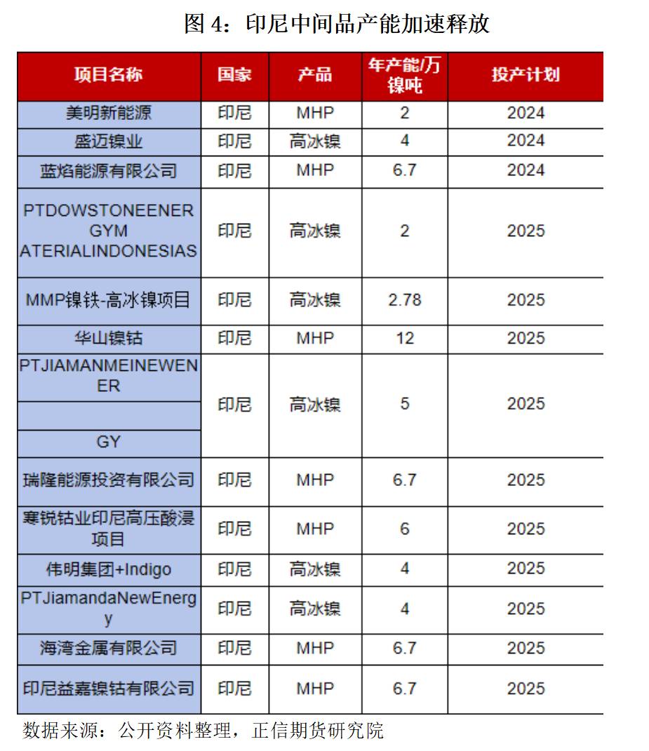 (二)湿法中间品:MHP冶炼成镍供给增量核心 湿法中间品的MHP是印尼镍供给近年来的增长引擎,2025年累计产量约47万吨镍金属,同比增长40.53%。去年核心增量来自华友钴业、格林美等中企的产能项目,届时其印尼湿法镍总产能将达36万吨。MHP的核心竞争力在于成本优势与产品适配性。当前印尼主流MHP生产成本较火法高冰镍低且即使受硫磺价格上涨影响,成本仍控制在11800美元/金属吨左右,同时MHP冶炼路线可通过其中的钴副产品抵扣成本。作为三元电池正极材料的核心原料,MHP兼具镍钴双元素回收效率,完美适配新能源需求增长,成为印尼镍产品结构转型的核心方向。