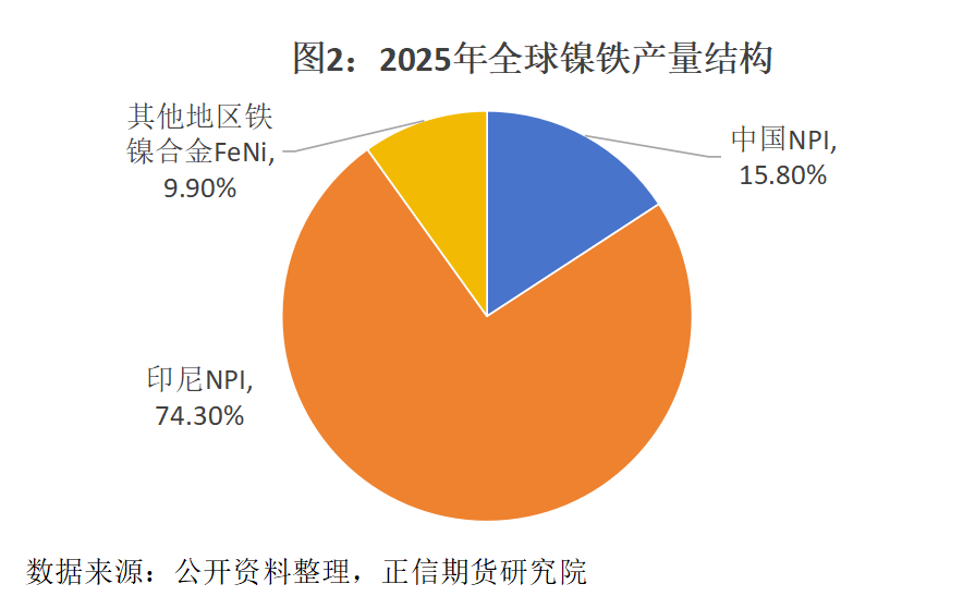 二、印尼:冶炼品供给双轮驱动,政策与成本主导格局 (一)镍铁:NPI绝对主导 印尼是全球NPI镍铁生产枢纽,2025年镍铁产量占全球总量的95%,但2026年供应增速或将由于印尼政府的收缩政策骤降。核心制约因素包括两方面:一是印尼官方宣布RKAB镍矿配额收紧,2026年配额从去年的3.64亿吨削减至2.5亿吨,降幅高达34%,直接限制镍铁生产的镍矿原料供给;二是中间品新建项目暂停审批政策,抑制了单纯镍铁冶炼产能的无序扩张。从需求看,不锈钢需求疲软(房地产拖累)导致下游采购压价,价格上行空间受限。不过,印尼镍铁仍具备成本优势,RKEF工艺凭借规模化生产与园区配套,成本较国内低10%-15%,成为全球镍铁市场的价格锚定点。