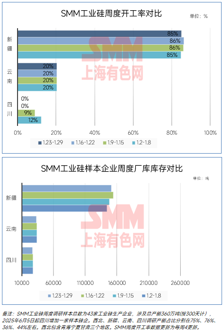 | 报告品种:工业硅 原文链接:https://mp.weixin.qq.com/s/wVlGAuDCCmWRYe7EOKjpJw 1月23日至1月29日: 新疆地区样本硅企周度产量在41180吨,周度开工率在85%,较上周环比微降。新疆样本硅企开工率趋弱,该时段内新疆样本大厂有少量产能检修,其他样本硅企开工基本稳定。对于新疆大厂东部厂区的减产计划,预计在1月31号开始落地执行,下周新疆样本开工率延续下降趋势。下游年前备货渐进尾声,叠加期货价格偏强震荡,周内硅企出货量以对盘面点价出货较多。 云南样本硅企周度产量在2360吨,周度开工率20%,较上周环比持平。样本选取原因云南样本硅企周度开工率高于地区总开工率。云南在产硅企多为生产化学级工业硅类型,生产以交付长单居多。 四川样本硅企周度产量为0吨,周度开工率在0%。较上周持平。川内硅企近期没有复产计划。