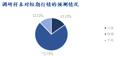 3、大部分贸易商对短期价格持稳心态 现阶段,市场成交已寥寥无几,价格涨跌主要受到钢厂调价影响,前期区域内钢厂完成冬季价格的上调,所以现阶段主流观点看稳,72.73%的商户认为短期价格将保持稳定。看跌与看涨并存,但占比较小,12.12%认为价格可能小幅下跌,15.15%认为可能上涨。