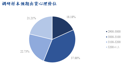 6、3100-3200价格是占比最大的心理预期售出价格 现西北各各区域价差较为稳定,各地商户冬储成本不一,但获利了结的意愿较强。参与调研的贸易商预期的出货价格在3000-3100元/吨占比达到37.88%,其余价位分布较为平均,每个价位占比20%左右具如下图: