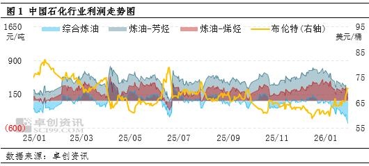 | 【导语】最新监测数据显示,截至1月30日当周,国内主要炼化路线利润普遍快速下滑。在原油价格显著上涨的背景下,下游产品价格传导普遍滞后,导致成本压力急剧凸显。其中,炼油-芳烃与炼油-烯烃路线虽保持盈利但利润大幅收窄,而综合炼油路线理论亏损进一步扩大至-490.96元/吨。 截至1月30日,三种生产路线炼化利润较上周快速下滑。具体来看,炼油-芳烃产业链理论利润为136.47元/吨,炼油-烯烃产业链为58.69元/吨,两者较1月23日当期分别下滑65.99%、80.51%,但目前保持盈利;综合炼油利润理论值跌至-490.96元/吨,亏损幅度扩张,较1月23日当期下滑108.56%。 本期利润普遍收缩,主要源于原油价格上涨带来的成本压力未能被下游产品价格同步上涨所消化。多数产品价格涨幅低于原料成本涨幅,导致利润空间被显著压缩。