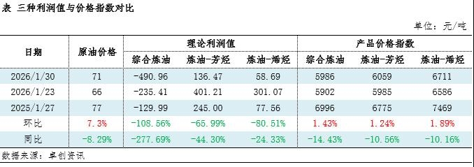 按照三种生产路线利润模型中的产品取样,对其价格进行赋权得出价格指数,通过对比利润值与价格指数的变化来进行分析,如下表所示。1月30日当期产品均价较上周环比来看,理论利润值的变化幅度排序为:炼油-芳烃(-65.99%)>炼油-烯烃(-80.51%)>综合炼油(-108.56%),产品价格指数的变化幅度排序为:炼油-烯烃(1.89%)>综合炼油(1.43%)>炼油-芳烃(1.24%),利润与价格变动幅度排序完全不同。造成这种差异的主因原因,在于产业链结构不同,综合炼油产业链短,且产品多为近油端产品,在原油价格上涨的情况下价格传导相对乐观,汽柴油等比重较大的品目价格反弹,其综合产品指数成为三种路线中环比涨幅居中,但产品价格上涨不及成本,仍难抵成本快速增长对利润带来的消极影响。