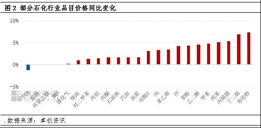 1月30日当期,超过86%的产品价格环上涨,仅EVA价格环比下滑,另外2类产品价格持平。图2主要石化产品价格的同比变化可以看出,即便多数产品价格上涨,然而,几乎所有产品的环比涨幅均落后于布伦特原油价格涨幅,再次印证了成本传导普遍不完全的现状。其中,丁二烯、丙烯腈、PP等产品价格主导涨幅的烯烃路线传导能力相对稍好,纯苯、甲苯、苯乙烯等产品主导涨幅的芳烃路线次之,而汽柴油等传统油品的价格传导则最为滞后。