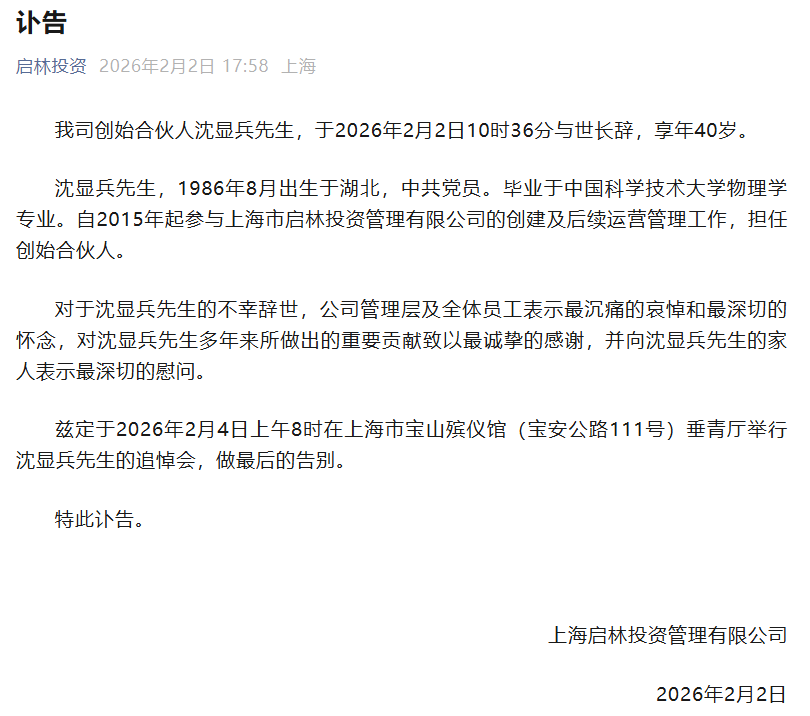 | 量化圈突发噩耗,又一位顶尖大佬匆匆落幕。 2月2日晚,百亿私募启林投资的一则公告,让整个金融圈陷入悲痛。公司创始合伙人沈显兵,于当日10时36分与世长辞,年仅40岁,距离他的40岁生日仅剩6个月。