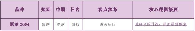 备注: 1.有夜盘的品种以夜盘收盘价为起始价格,无夜盘的品种以昨日收盘价为起始价格,当日日盘收盘价为终点价格,计算涨跌幅度。 2.跌幅大于 1%为弱势,跌幅 0~1%为偏弱,涨幅 0~1%为偏强,涨幅大于1%为强势。 3.偏强/偏弱只针对日内观点,短期和中期不做区分。 主要品种价格行情驱动逻辑—商品期货能源化工板块 原油(SC) 日内观点:偏强 中期观点:震荡 参考观点:偏强运行 核心逻辑:近期美国总统特朗普频繁释放地缘风险信号,格陵兰岛、加拿大或成为美国下一个夺取和打击的目标。经历短期大幅回调以后,油市利空情绪得到释放。由于中东地缘风险依然存在,且北半球处在冬季用油旺季阶段,偏多氛围重新凝聚。本周三夜盘,国内原油期货维持震荡上下的走势,期价大幅收涨。预计本周四国内原油期货或维持震荡偏强的格局。 责任编辑:七禾小编 |