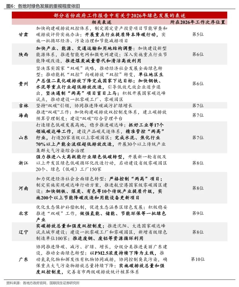 其四,绿色发展依然占有稳固地位。虽然2026年各省对于绿色发展的排序先后不同,但大多都对“双碳”工作做出明确部署,其中浙江甚至还在开年专门召开了“双碳”工作部署推进会。钢铁、水泥、焦化、有色等高耗能行业,以及“两高”项目,将成为碳排放监测与改造的重点对象。此外,各地普遍将建设“零碳园区”、“零碳工厂”、构建碳排放双控制度等作为关键举措,推动绿色工作从目标导向转向项目化、系统化落实。