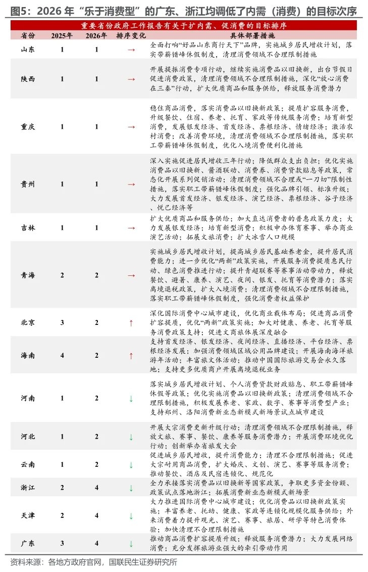 其三,地方的“促消费”虽然作为重点工作部署,但并非当务之急。尽管各地均对国家层面提出的消费品以旧换新、清理消费领域不合理限制、丰富服务消费供给等政策进一步落实安排,但对比2025年地方政府工作报告来看,今年各地对“扩内需、促消费”相关任务的次序安排,多数保持稳定或有所后移(包括我们此前报告《提升消费率:中国的四类画像》提到的“乐于消费型”的广东、浙江,其2026年工作报告均将内需的工作次序下调)。 在2026年开局工作中,地方政府仍将有限的政策资源与注意力,更多向产业升级、科技创新等任务倾斜。相较之下,消费的拓展则被视为需在“十五五”规划期中长期维度中稳步推进、持续深化的系统性工程。