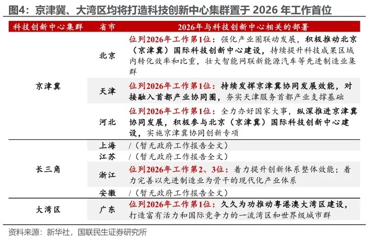 其二,经济大省将“卯足劲”搞科技。随着中央经济工作会议将我国国际科技创新中心布局从北京、上海、大湾区,拓围至京津冀、长三角、大湾区三大区域,2026年这些地区在政府工作报告中,几乎“清一色”将打造科技创新中心集群置于全年工作的最领先位置,显示出区域协同创新已成为驱动高质量发展的核心战略。