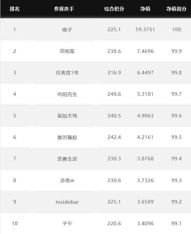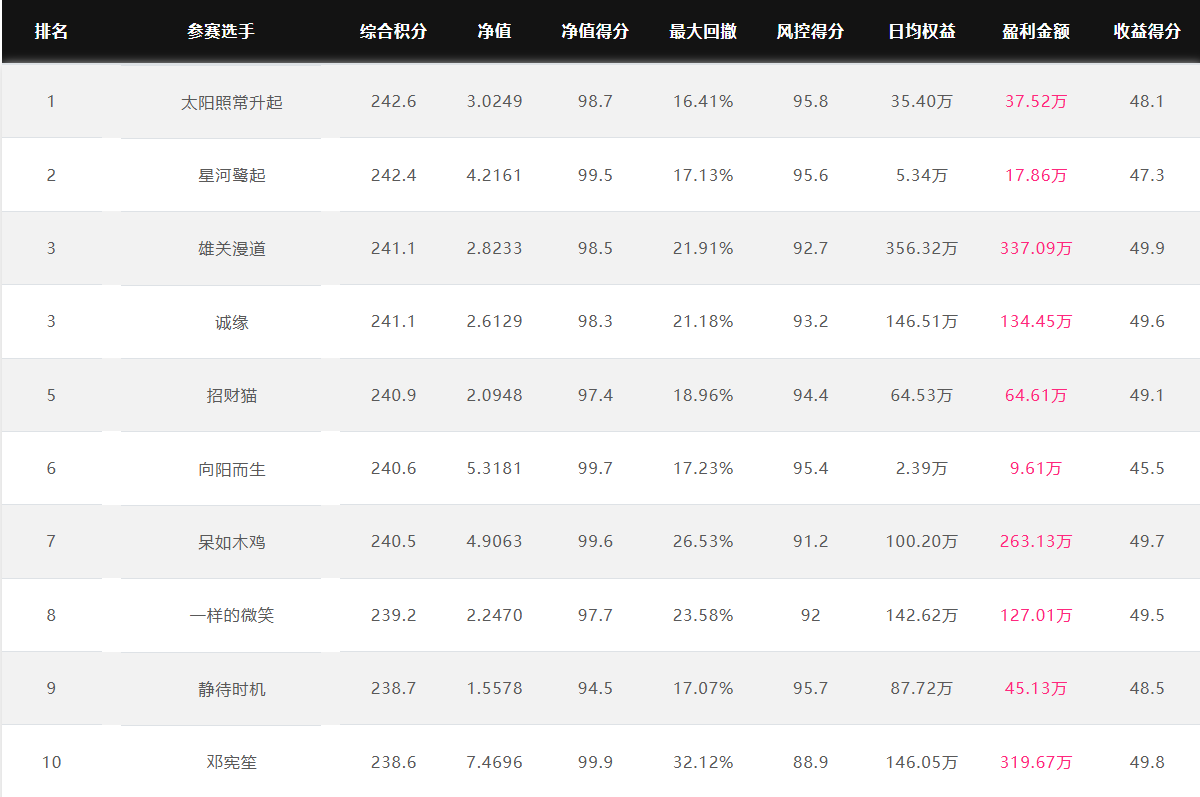 奖金上不封顶 特定期货公司参赛奖金翻倍 优秀选投 每周选优秀选手对接资金 达标必投 单笔最多给1个亿管理型资金 管理型资金盈利分成20%~70% 免费培训/研报/调研/咨询 诚邀您参赛! 为了促进国内期货市场交易人才的发展和成熟,七禾网举办本次“期货CTA英雄联盟”实盘大赛&超级服务,招募优秀的操盘手,为优秀的交易人才搭建桥梁! 第四届大赛圆满结束,第五届荣耀开启,欢迎参赛!第五届大赛已于2025年7月1日开赛,火热报名中,比赛过程中持续接受报名,大赛奖金&管理型资金&超级服务,等你来领! 2023年2月16日后,在主办方指定的几家期货公司中的某一家C公司新开户参赛,享奖金翻倍! 在主办方指定的几家期货公司中的某一家B公司新开户参赛,享奖金翻倍! 大赛中的优秀选手,只要在大赛中有3个月及以上的实盘业绩,主办方将每周发送优秀参赛者的业绩、资料给合作的数十家资方,供其考察是否投管理型资金。至2022年8月12日,资方已选出23名优秀投顾,累计投入超5.5亿元管理型资金。 优秀选投:通过主办方及资方考核后,将获得管理型资金(资金来源:七禾网自有资金(买优秀选手的基金产品)、七禾网股东、数十家合作资方) 在主办方指定的几家期货公司中的某一家B公司新开户参赛,以及2023年2月16日后,在主办方指定的几家期货公司中的某一家C公司新开户参赛,可以按照:“达标必投”进行考核(将给予单笔100万元~1亿元的管理型资金,分红比例20%~70%),详细规则请联系微信:15858201632 大赛综合排名前10名 2026.2.4