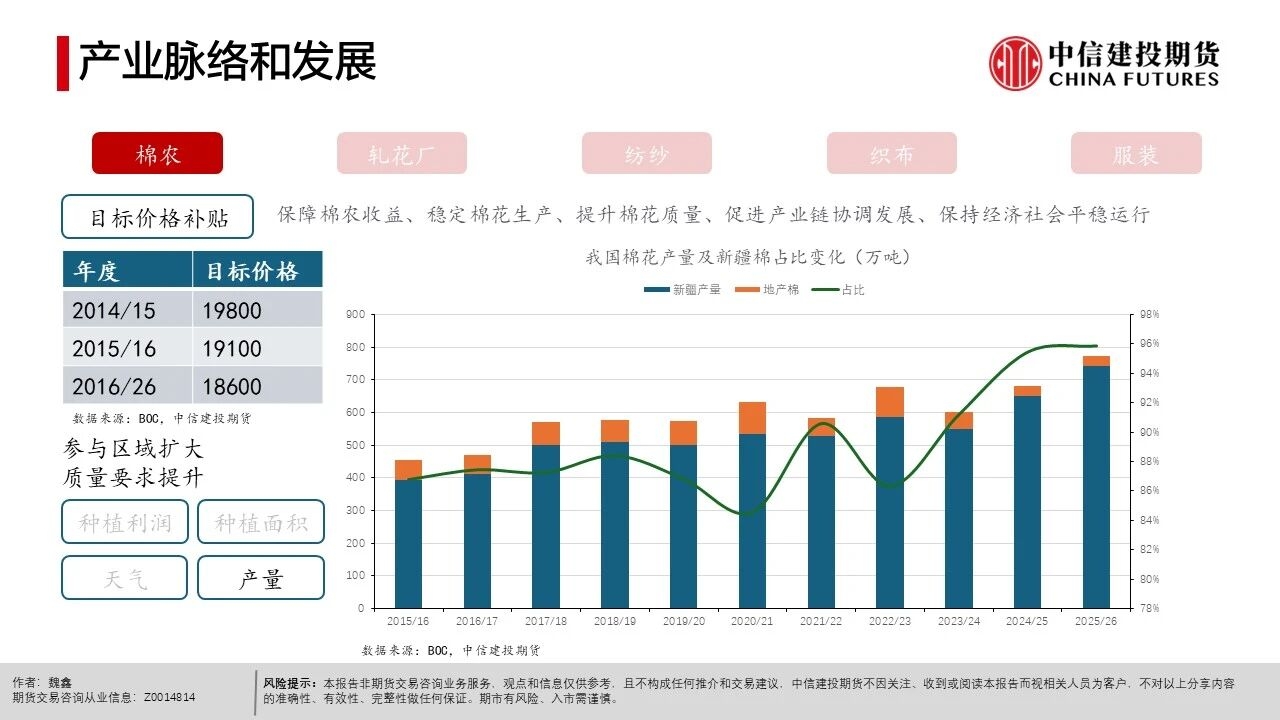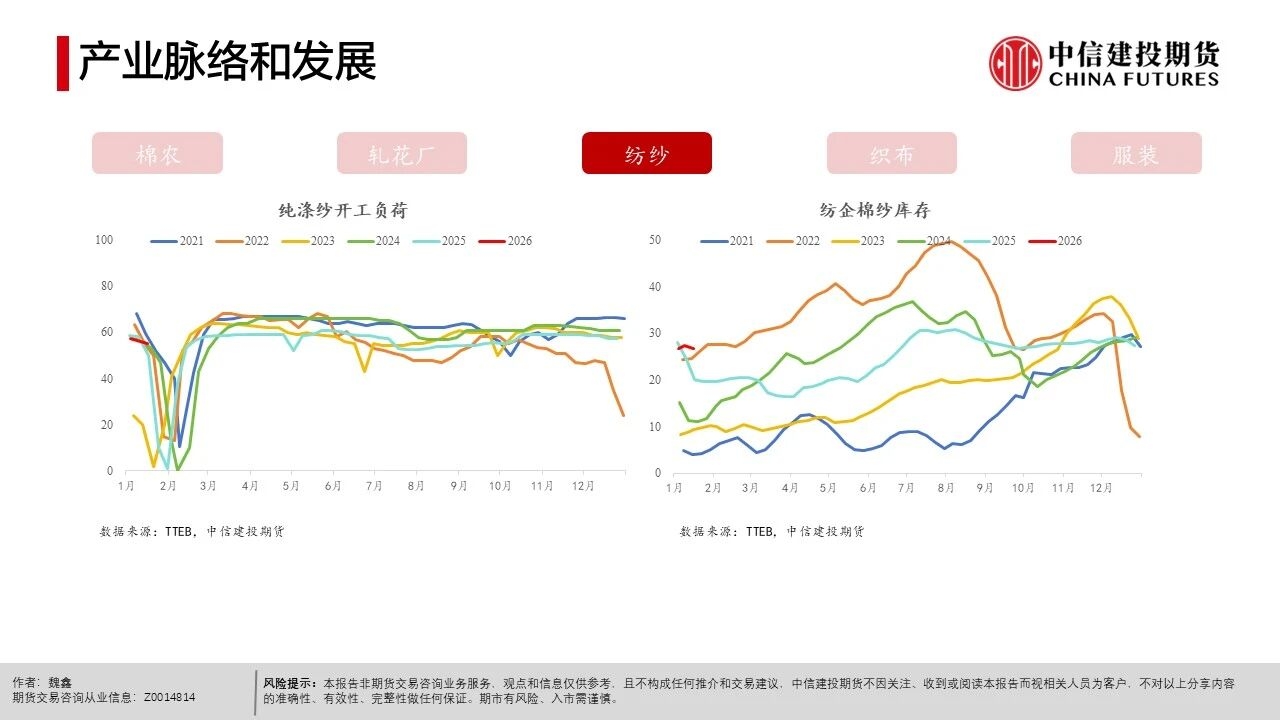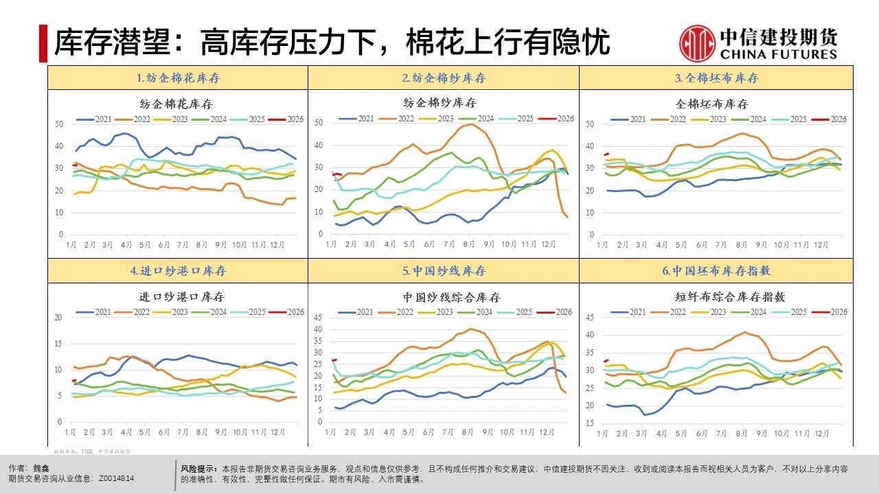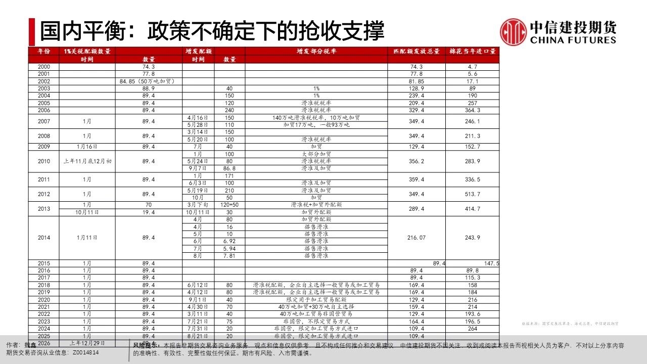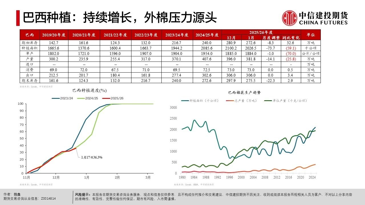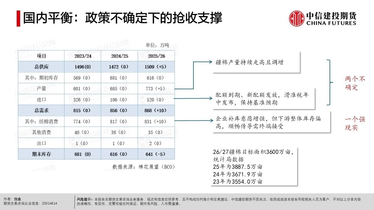 | 一、全球棉花供需格局:巴西植棉的激增 全球棉花生产格局正经历深刻变革。从生产端看,2012年至今全球棉花种植面积呈现震荡收缩态势,核心制约来自中美两大主产国。中国长期执行"控面积、提质量"政策,新疆地区虽存在扩张冲动但受政策约束;美国种植面积保持稳定;澳大利亚2025年种植面积出现明显收缩。唯一具有持续增产潜力的巴西,其2526年度产量预计达300万吨以上,较2010年增长三倍,主要得益于中西部地区推行大豆-棉花轮作模式提升土地利用率。然而全球单产水平差异显著:巴西达到1950公斤/公顷,中国维持更高水平,而印度仅500公斤/公顷,显示不同产区潜力悬殊。需重点关注巴西产量的可持续性(单产已达1950公斤/公顷,但新年度预计略有下滑)及印度MSP支持政策(2025年上调9%)对农民种植意愿的刺激。 需求端呈现刚性收缩特征。全球棉花消费高度集中于服装纺织领域,面临化纤替代的持续冲击。中国、印度、巴基斯坦及东南亚国家构成主要需求方,其中中国年消费量约700-800万吨,但近年受外贸环境变化影响,需求增长明显放缓。值得注意的是全球贸易流向因政策干预发生重构:美国对新疆棉制裁导致贸易格局重塑,巴西棉成为中国主要进口来源,美棉则转向东南亚市场。这种结构性变化使得全球棉花市场呈现"区域割裂"特征,内外价差持续存在。 库存周期成为关键变量。2025年全球期末库存消费比攀升至75%左右,处于历史偏高水平,主要压力来自巴西创纪录产量与中国进口需求减弱。但库存分布不均,中国以外市场库存压力更为显著,这也是近期外盘价格表现弱于内盘的核心原因。 二、中国市场政策体系:关于面积收缩的追问 中国棉花市场运行深受政策影响,形成独特的"政策市"特征。进口管理方面实行双轨制配额体系:关税配额定为89.4万吨/年,适用1%优惠税率;滑准税配额则在年中发放,约20万吨规模。计算显示,配额外进口成本形成价格天花板,当外棉价格低于14000元/吨时,滑准税计税价格约13000元/吨,显著低于国内现货,这也是当前保税区库存积压至80万吨以上的直接原因。生产端通过目标价格补贴制度稳定种植收益。新疆地区连续三年维持18600元/吨的目标价格,使得棉花种植收益维持在30%左右,显著高于玉米(15%)、红枣等竞争作物。高收益保障催生种植刚性,尽管政策层面倡导"退棉减面积",但实际执行存在反复。2026年正值政策调整窗口期,市场预期目标价格可能微调至18300元/吨,种植面积指引3600万亩,较当前3800万亩有所收缩,这一预期正成为当前市场交易的重要逻辑支点。 产业链中游的轧花厂环节呈现典型"竞争性收购"特征。新疆地区轧花厂数量达1200余家,产能严重过剩导致收购季易出现非理性抢收。历史数据显示,在供给偏紧年份,轧花厂溢价收购可能推升成本300-500元/吨,形成"成本粘性"。这种特性使得棉花价格在收购季结束后往往呈现抗跌性,直到新季种植面积确定才可能打破平衡。 三、产业链行为:现货基差显著放大,抢货的细节 生产者环节的决策周期具有明显季节性特征。棉农在4月前后做出种植决策,主要考量目标价格政策、替代作物收益比较及劳动力成本。新疆地区棉花种植需5-6次田间管理,人工成本占总成本40%以上,这与玉米等作物形成显著差异。而在销售端,棉农需在12月31日前完成销售才能获得补贴,这一时间节点往往形成季节性供应压力。 轧花厂经营策略呈现典型博弈特征。其利润来源于籽棉加工差价与棉籽副产品收益,当前棉籽价格约1600元/吨,可抵消部分加工成本。由于产能过剩,轧花厂普遍采取"以量补价"策略,在9-11月收购季积极抢收原料,哪怕短期亏损也要维持开工率。这种行为模式放大了价格波动,如2025年底中棉集团在拍卖市场溢价收购,直接推升市场情绪。 纺织环节面临结构性压力。监测数据显示,2026年初纺纱企业开工率仅65%,较往年下降10个百分点,但产品库存却攀升至25天以上,呈现"高库存、低开工"的困境。分区域看,常州地区牛仔布开工率维持70%,南通家纺集群开工65%,而张家港针织面料基地受外贸订单减少影响开工率不足60%。这种分化体现下游需求的多层次特征。 进口纱冲击成为潜在变量。2025年中国棉纱进口量达150万吨,预计2026年将突破180万吨。由于纱线进口不受配额限制,当内外价差超过2000元/吨时,进口纱对国内纺企形成持续压力。特别是印度纱线质量提升后,对中低支纱市场的替代效应日益显著。 四、行情驱动要素 全球市场来看内外价差持续高位反映结构分化。美棉出口进度成为外盘风向标,每年2-4月是美棉出口高峰期,当前装运量同比基本持平,但面向东南亚的出口增长15%。巴西新季种植进度受大豆收获延迟影响,马托格罗索州种植推迟两周,可能为全球供给带来变数。 短期来看市场焦点集中于政策预期与库存消化。当前轧花厂成本固化在16000-16500元/吨区间,形成强支撑。但下游纺织企业原料库存已备至4月,后续采购动力不足。关键观测点在于3-4月传统旺季需求成色,若纺织企业开机率无法提升至75%以上,负反馈压力将逐渐显现。跟踪:中低支纱的报价变化(其对需求转弱更为敏感)、以及保税区棉花库存的累积情况,来捕捉供需矛盾的细微变化 中期维度(2026二季度)需关注两大政策落地:一是新一轮目标价格政策公布时点(预计4月),若维持18600元/吨则提振种植意愿;二是滑准税配额发放(6-8月),将直