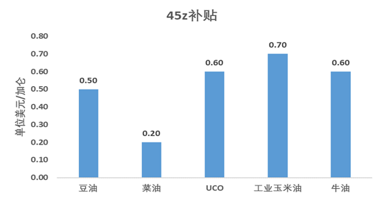 数据来源:EIA,国投期货 我们预计的45Z补贴(排除了间接土地利用)如下图,从植物油角度看北美工业玉米油更有补贴优势,利于玉米乙醇的发展和乙醇制可持续航空燃料的发展。北美豆油补贴次之,比2024年之前的补贴下降了,预计行业利润的改善更多可以通过RIN(可再生燃料识别码)偏强来改善利润。从45z的政策角度看,使用了北美本土原料,才能拿到补贴,更利于北美本土原料的需求。 考虑极端情况,如果海外原料价格足够低,能够不去申请45z税收补贴,弥补补贴差额。美加墨的UCO能拿到0.6美分/磅补贴,如果进口非美加墨UCO足够便宜,跟北美的UCO价差拉开距离能覆盖住补贴的差异,非美加墨UCO比北美区域便宜大约7美分/磅(154美元/吨)。美加墨的豆油能拿到0.5美分/磅补贴,如果进口非美加墨豆油足够便宜,跟北美的豆油价差拉开距离能覆盖住补贴的差异,非美加墨豆油比北美区域便宜大约6-7美分/磅(132-154美元/吨)。不过由于海外市场像东南亚市场以及亚洲市场也在进行可持续航空燃料的扩张,预计非美加墨地区的原料也不容易走独立疲弱的行情,上述价差仅供极端情况的参考,后续可以持续关注其他区域的工业需求发展情况。