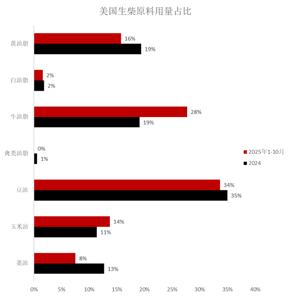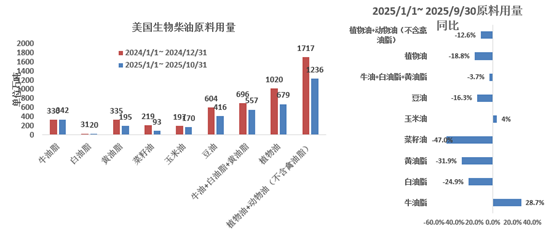 数据来源:美国农业部,国投期货 2025年由于美国生物燃料政策发生了变化以及关税矛盾,从1美元/加仑的补贴转为45Z的补贴,对进口原料来源地进行了限制,不过2025年由于政策迟迟没有确定,市场的贸易流向并没有完全切断,从实际进口角度看,并没有完全停止海外原料的进口。 从2025年1-11月黄油脂的进口量来看,同比下降了28万吨,降至199万吨,降幅为12%,美国减少了从中国的进口量,增加了从澳大利亚和韩国的进口量。其中非美加墨地区的进口量为175万吨,占比为87%。 从2025年1-11月牛油脂的进口量来看,同比增加17万吨,增至96万吨,增幅为21%,美国增加了从巴西和阿根廷的进口量。其中非美加墨地区的进口量为81万吨,占比为84%。 从2025年1-11月菜籽油的进口量来看,同比下降81万吨,降至227万吨,降幅为26%,美国减少了从加拿大菜籽油的进口量。美国菜籽油主要是从加拿大进口。