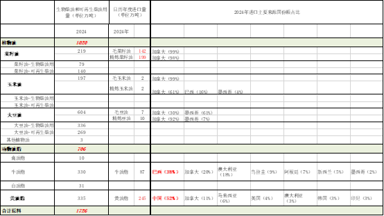 数据来源:EIA,国投期货 美国原料进口来源情况美国2024年生物燃料原料需求量是2000年以来的需求最高点,当时原料补贴没有按照碳排放进行分类,统一按照1美元/加仑进行补贴。所以主要的特点是黄油脂进口量大增,其中52%来自中国。牛油脂进口量也增长,其中38%来自巴西。2024年黄油脂总进口量为245万吨,非美加墨地区的进口量为215万吨,占比为88%。2024年牛油总进口量为87万吨,非美加墨地区的进口量为68万吨,占比为78%。