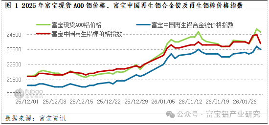 | 报告品种:铝 原文链接:https://mp.weixin.qq.com/s/S38qFruebDeLFPEVMezZqQ?scene=1&click_id=6 进入2026年1月以来,铝价迎来爆发式行情,基本面偏弱的现实并未能挡住宏观情绪过热的势头。近期价格波动更是跌宕起伏,截至1月30日,富宝A00现货铝价报24660元/吨,较25年底上涨2410元/吨,涨幅10.73%;1月均价24084元/吨,环比上涨2153元/吨,涨幅9.82%;富宝中国再生铝合金锭价格指数报23500元/吨,环比上涨8.72%,1月均价23175元/吨,环比上涨9.14%;富宝中国再生铝棒价格指数报23900元/吨,环比上涨8.89%,1月均价23825元/吨,环比上涨8.36%。推动价格强势上涨的主因有:一是资金轮动致资源流通增加;二是地缘局势扰动影响国际铝资源流动;三是需求端AI、储能、铝代铜等多方热点加持,但国内多地铝棒及建筑型材等领域消费压力仍存;四是美联储的宽松预期不减,美元持续走弱,对铝价进一步提振。