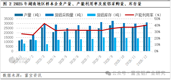 据富宝调研数据显示:12月湖南地区样本铝企产能利用率均值录得38.9%,环比增加2.68%;样本企业总产量约为2.87万吨,环比增加7.71%;废铝总采购量约3.12万吨,环比增加4.27%;废铝库存量为1.55万吨,环比增加10.32%。当月国内多地均由于环保管控、反开核查、税负成本等因素影响使得大度企业的生产经营出现不同程度的下滑,但从湖南样本企业调研情况来看,2025年下半年湖南地区再生铝厂生产经营的综合情况较为稳定。进入1月以来,因铝价持续攀升,下游消费减弱,订单下滑,导致产能利用率下降;另一方面部分厂家设备升级维护出现明显停工停产情况,当地再生铝企整体生产情况不容乐观,预计1月产量或下滑近20%左右。