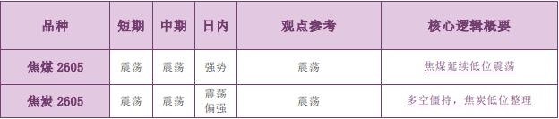 备注: 1.有夜盘的品种以夜盘收盘价为起始价格,无夜盘的品种以昨日收盘价为起始价格,当日日盘收盘价为终点价格,计算涨跌幅度。 2.跌幅大于 1%为弱势,跌幅 0~1%为震荡偏弱,涨幅 0~1%为震荡偏强,涨幅大于 1%为强势。 3.震荡偏强/偏弱只针对日内观点,短期和中期不做区分。 ◼ 主要品种价格行情驱动逻辑—商品期货黑色板块 品种:焦煤(JM) 日内观点:强势 中期观点:震荡 参考观点:震荡 核心逻辑:现货市场方面,甘其毛都口岸蒙煤最新报价为 1200.0 元/吨,周环比下跌 3.2%。整体来看,焦煤基本面无明显变化,相对利好或有三方面:其一是下游冬储仍在进行,对焦煤现货带来一定支撑;其二是春节临近,煤矿或有提前停产放假的预期;其三是中东局势紧张,原油地缘溢价带动能源类商品走强。不过,缺乏国内政策面和焦煤基本面支撑,焦煤期货依然缺乏持续上涨的动能,预计近期价格仍将维持区间运行。(仅供参考,不构成任何投资建议) 品种:焦炭(J) 日内观点:震荡偏强 中期观点:震荡 参考观点:震荡 核心逻辑:现货市场方面,日照港准一级湿熄焦平仓价格指数最新报价为 1520 元/吨,周环比上涨 3.40%;青岛港准一级湿熄焦出库价为 1480 元/吨,周环比上涨 2.07%。当前,焦炭基本面无明显向上驱动,需求端中长期担忧依然存在,压制焦炭期货低位运行,但考虑到经济政策预期以及煤炭行业反内卷政策预期,焦炭深跌也存有明显阻力。整体来看,市场多空僵持,尚无明显的中长期矛盾,预计焦炭期货暂维持低位区间运行。(仅供参考,不构成任何投资建议) 责任编辑:七禾小编 |