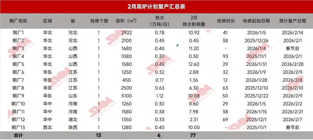数据来源:SMM 根据SMM最新调研数据,目前全国钢厂在2月暂无新增检修计划;预计有13座高炉陆续复产,日均产量预计增加约6万吨。总体来看,2月份高炉运行以复产为主,预计当月日均铁水产量月度均值环比提升约3万吨,维持持续回升趋势。 然而,考虑到2月正值春节传统淡季,今年冬储力度整体偏弱,钢厂在节日期间基本保持正常生产,但下游工地将于下周起全面停工。在此背景下,钢厂成材库存预计在春节期间加速累积,当前钢厂已面临一定库存压力。因此,春节后终端需求的实际恢复节奏,将成为影响钢厂生产积极性的关键因素。 此外,河北地区近期启动新一轮环保限产,若天气状况进一步恶化,邯郸地区部分钢厂可能采取闷炉措施。综合以上因素,预计2月份日均铁水产量虽有望环比增长,但整体提升幅度可能仍低于此前预期。