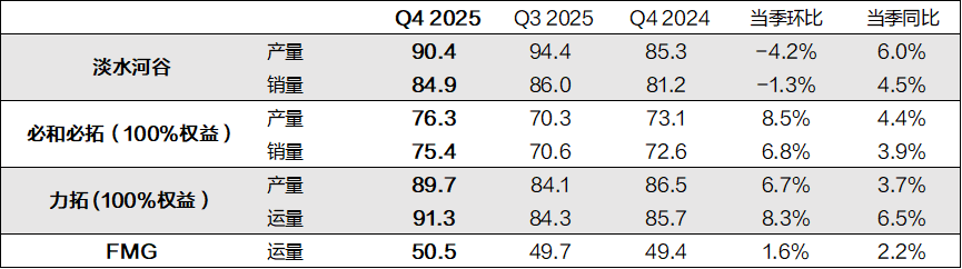 | 淡水河谷 2025年四季度铁矿石粉矿产量为9040.3万吨,同比增加6%,环比下降4.2%,铁矿石销量达8487.4万吨,同比增加4.5%,环比下降1.3%。淡水河谷25年四季度表现良好,这也使其最终略超预期的完成了年度指导目标。近期淡水河谷发生事故,我们预计将对产量有阶段性负面扰动,由于并未对矿区造成显著影响,预计最终不会影响26年度指导目标的完成。力拓2025年四季度皮尔巴拉地区铁矿石的产量为8970万吨(100%基准),同比增加4%,环比增加7%,发运量为9130万吨(100%基准),同比增加7%,环比增加8%。 力拓 25年四季度的产销增长明显。尽管西芒杜暂时提供的增量有限,但西澳地区的良好运营和有利天气仍然使其第四季度实现了创纪录的产量和发运量。必和必拓2025年四季度西澳地区铁矿石的产量为6777万吨(100%基准下为7633万吨),同比增加5%,环比增加9%;销量为6691万吨(100%基准下为7540万吨),同比增加4%,环比增加7%。 必和必拓 25年四季度产销均出现了改善,这主要得益于前期计划内的项目进展顺利,供应链效率得到了改善。FMG2025年四季度铁矿石的发运量为5050万吨,同比增加2%,环比增加1%,矿石开采量为6140万吨,同比下降1%,环比增加2%。 FMG 25年四季度表现依然较好,整体发运稳中有增并维持年度指导目标不变。虽然铁桥项目短期产能继续释放的量相对有限,但考虑到其整体产业链的强劲表现,我们预计未来产销将继续保持增长。整体来看,四大矿山25年四季度表现均较为强劲,这也与前期较强的海外发运高频数据相一致。一季度四大矿山将受到飓风季和雨季的影响,我们预计发运将出现季节性走弱,但考虑到去年一季度基数较低,所以同比增速或并不会太差。 表1:四大矿山产销数据(百万吨)