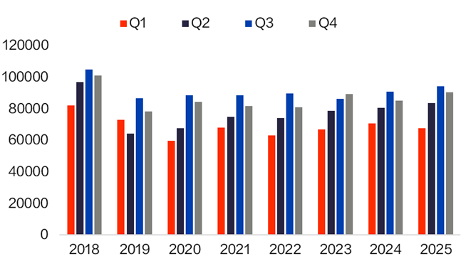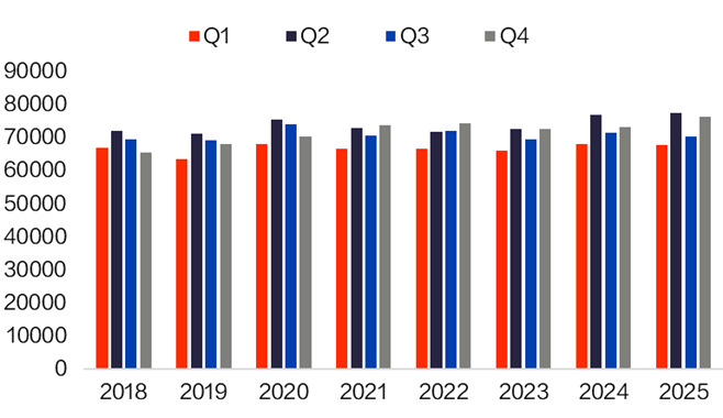 数据来源:公开资料,国投期货整理 必和必拓25年四季度产销均出现了改善,这主要得益于前期计划内的项目进展顺利,供应链效率得到了改善。必和必拓保持2026财年的指导目标不变,我们预计未来一季度的整体产销仍将偏强。 四、FMG FMG 2025年四季度铁矿石的发运量为5050万吨,同比增加2%,环比增加1%,矿石开采量为6140万吨,同比下降1%,环比增加2%。FMG 维持2026财年的发运目标1.95-2.05亿吨不变,其中铁桥项目预计将贡献1000-1200万吨(100%权益)。 图5:FMG分季度运量(千吨)