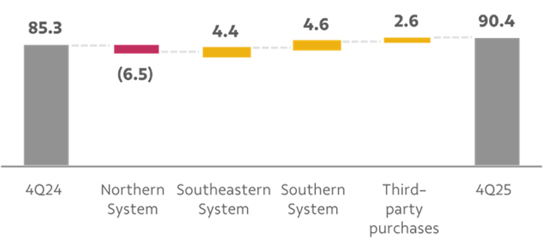 数据来源:Mysteel,国投期货整理 北部系统 25年四季度产量同比下降650万吨至4480万吨。一方面是由于Serra Norte的原矿可用性仍然存在影响,其中部分影响被产品组合的调整所抵消,另一方面则是受到了S11D计划内的维护活动的影响。S11D在2025年实现了创纪录的8600万吨产量,得益于持续改进的运营效率。 东南部系统 25年四季度产量同比增长440万吨至2390万吨。除了得益于Brucutu更高的原矿可用性外,Capanema项目的增产也起到了积极影响。Capanema在四季度的产量达300万吨,并预计将于2026年二季度达到满负荷生产。 南部系统 25年四季度产量同比增长460万吨至1350万吨。主要得益于VGR1项目的增产和Pico的稳健表现所带来的Vargem Grande综合设施的效率提升,以及Fabrica和Mutuca更高的产量所带来的Paraopeba综合设施的效率提升。 球团矿 25年四季度球团矿的产量同比下降80万吨,主要是应对当前市场状况而对生产进行了调整。原本用作球团厂原料的球团精粉被作为铁矿石粉矿销售,以优化整个产品组合的价值。Sao Luis球团厂在本季度仍处于维护状态,Vale将根据市场状况评估潜在复产时间。 图2:淡水河谷产量变动分地区归因(百万吨)