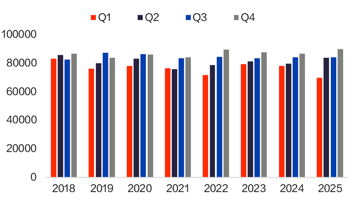数据来源:公开资料,国投期货整理 25年四季度铁矿石销量为8490万吨,同比增长370万吨,与产量增长保持一致。综合溢价达到0.9美元/吨,环比下降1.2美元/吨,主要原因是低铝产品的市场溢价减少。基于当前市场状况及产品组合的灵活性,Vale继续优先提供中品位产品,如新的中品位卡拉加斯产品、混矿产品(BRBF)以及在中国销售的精选产品(PFC),旨在最大化利润率和价值创造。淡水河谷25年四季度表现良好,这也使其最终略超预期的完成了年度指导目标。近期淡水河谷发生事故,我们预计将对产量有阶段性负面扰动,由于并未对矿区造成显著影响,预计最终不会影响年度指导目标的完成。 二、力拓 2025年四季度皮尔巴拉地区铁矿石的产量为8970万吨(100%基准),同比增加4%,环比增加7%,发运量为9130万吨(100%基准),同比增加7%,环比增加8%。IOC球团和精粉的产量为220万吨,同比下降14%,环比下降7%。力拓25年总发运量为3.26亿吨(100%权益),处于年度指导目标(3.23-3.38亿吨)的下半部分。 图3:力拓分季度产量(100%权益)(千吨)