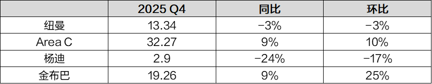 数据来源:Mysteel,国投期货整理 必和必拓表示西澳方面上半年产量和发运量创下纪录,主要得益于供应链中包括矿山、铁路和港口运营的强劲表现,以及创纪录的开采量(增长9%)。3号卸车机重建工作在26财年一季度完成(影响产量430万吨,100%基准),加上铁路技术项目(RTP1)计划内的连接作业减少,这使得卸车机和整个铁路网络的效率得以提升,并且也使得流入港口的铁矿石数量增加。必和必拓报告中表示与中国矿产集团的年度合同谈判仍在进行当中,并且这件事已经对铁矿石的实际价格产生了影响。 分品种来看,同比方面,四季度杨迪和纽曼产量下降,C矿区和金布巴的产量出现增长;环比方面,金布巴产量大幅增长,C矿区产量也有所改善,而杨迪和纽曼仍然下滑。 表3:BHP权益下西澳地区分品种产量(百万吨)