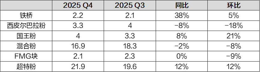 数据来源:Mysteel,国投期货整理 FMG表示本季度铁矿石总发运量5050万吨,推动2026财年上半年总发运量达到1.002亿吨,较2025财年上半年增长3%,创下历史上最高的上半年发运量。其中本季度铁桥精粉发运量220万吨,2026上半财年总计430万吨,较2025财年上半年增长37%。 本季度赤铁矿C1成本为19.10美元/湿吨,较第一季度增长5%,主要反映了前一季度有利库存变动的正常化,以及柴油价格和澳元兑美元汇率的影响。2026财年赤铁矿C1成本指导目标保持17.50 - 18.50美元/湿吨不变,基于澳元兑美元0.65的指导汇率。 分品种来看,25年四季度FMG主流品种的产销结构变化不大,其中混合粉发运有所减少,超特粉发运则增幅相对较大。铁桥方面虽然同比和环比均有所增长,但目前基数仍然偏低。 表4:FMG分品种发运(百万吨)