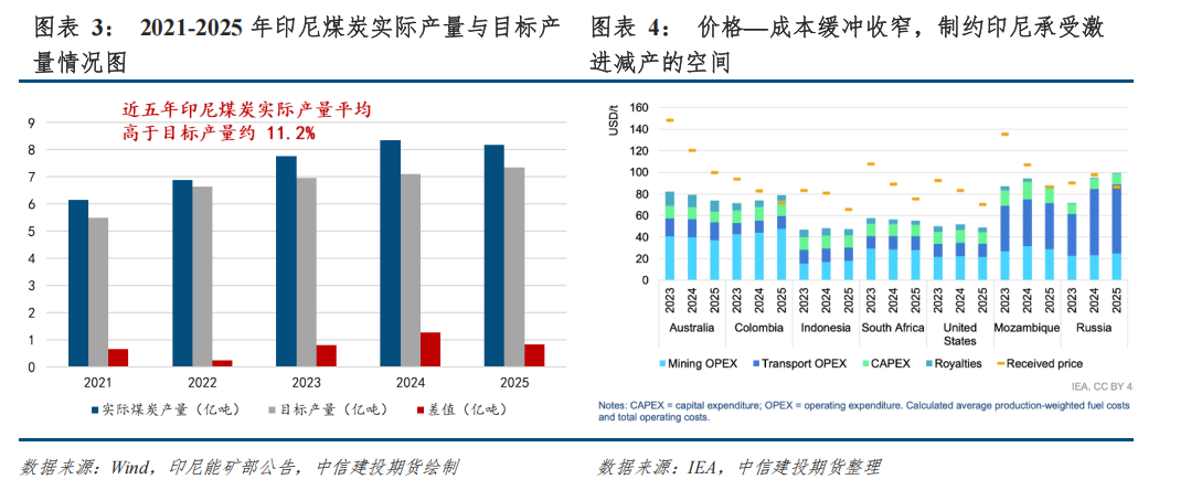 二、预期差:减产目标的实际执行或面临折扣 市场当前对印尼煤炭供给的关注,更多聚焦于官方提出的减产目标,并据此对供给收缩幅度形成相对一致的预期。但我们认为,市场对官方公布的 24%减产目标不应盲目乐观,实际执行层面极大概率出现“缩水”。 ⚫ 历史惯性的修正:从历史执行情况看,印尼煤炭产量在执行层面往往高于年度管理目标,配额约束存在一定弹性。年度目标更多体现政策导向与管理意图,而非刚性约束,在财政收入、行业稳定与市场份额等现实因素作用下,实际产量往往具备一定上行弹性。 ⚫ 利益一致性约束:从政府与产业的共同利益角度看,出口长期停摆并非可持续状态。若现货出口受限时间过长,不仅将直接影响政府财政收入,也可能促使需求端加速寻找替代来源,削弱印尼在低卡动力煤市场的份额与定价优势,反而不利于“控产稳价”目标的实现。 ⚫ 成本约束强化:从产业成本结构出发,当前下发的配额水平在部分矿商处已显著压缩产量规模。若按名义减产幅度严格执行,高成本矿企的产量将不足以覆盖固定成本,经营与现金流压力将迅速放大,对行业稳定性形成掣肘,这也是矿商集中表达异议、并通过调整出口节奏进行反馈的重要原因。 ⚫ 时间对冲:从短期时间窗口看,本轮出口扰动发生在春节及斋月前夕,亚洲主要消费国的采购与交易活动已在前期阶段性完成,边际需求对供给扰动的即时反应相对有限。这也意味着,短期价格表现更多反映预期与情绪变化,而非已兑现的实质性供给缺口。