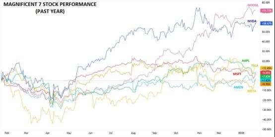 以绝对金额计算,“七巨头”2026年的资本支出预计累计将超过6000亿美元。市场对“谁能从AI基建和变现势头中尝到甜头”和“谁能在不侵蚀自由现金流的情况下维持支出”的关注,超过了对其AI战略“真实性”的讨论。