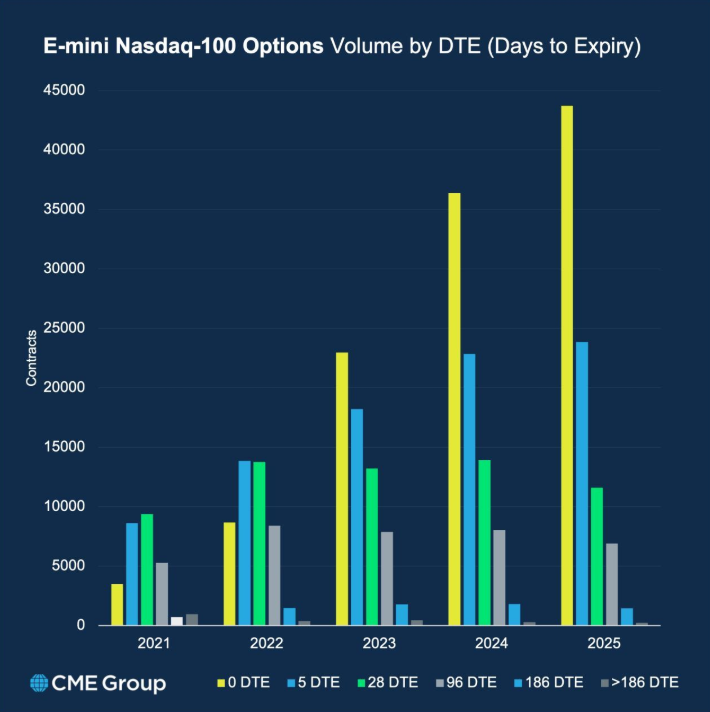 基于以上分析,投资者在进行交易布局时应保持谨慎态度,控制仓位,除关注核心科技龙头,把握行业增长机遇外,也要进行分散投资,规避单一板块波动带来的风险,可以适当配置一些金融衍生品,对冲市场不确定风险。芝商所的E-迷你纳斯达克100期权合约是对标纳指的金融衍生品,该产品0DTE(零日到期)与短期期权的激增,凸显了投资者对交易精准度与灵活性日益增长的需求。随着 META、TSLA 和 AAPL 等权重股密集发布财报,E-mini 纳斯达克100期权能够帮助交易者精准锁定事件波动率,从而绕过宏观环境的“噪音”。由于每个工作日都有到期日可供选择,投资人将拥有足够的颗粒度,以极高的灵活性应对财报季。