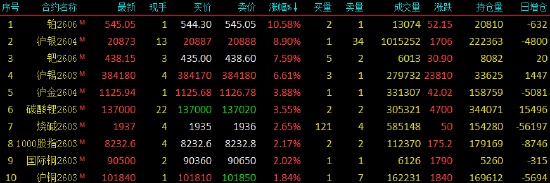 | 2026年2月9日,国内期货主力合约涨跌不一。铂涨近11%,沪银涨超8%,钯涨超7%,沪锡涨超6%,碳酸锂、沪金涨超3%,烧碱涨超2%,国际铜、沪铜涨近2%;跌幅方面,苯乙烯(EB)跌超2%,原木、硅铁、低硫燃料油(LU)、锰硅、焦炭、沥青、苹果跌超1%。