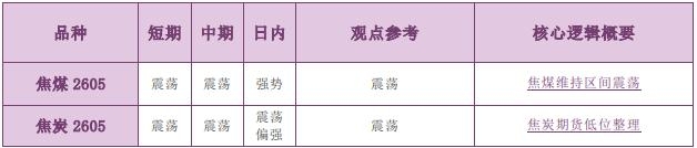 备注: 1.有夜盘的品种以夜盘收盘价为起始价格,无夜盘的品种以昨日收盘价为起始价格,当日日盘收盘价为终点价格,计算涨跌幅度。 2.跌幅大于 1%为弱势,跌幅 0~1%为震荡偏弱,涨幅 0~1%为震荡偏强,涨幅大于 1%为强势。 3.震荡偏强/偏弱只针对日内观点,短期和中期不做区分。 ◼ 主要品种价格行情驱动逻辑—商品期货黑色板块 品种:焦煤(JM) 日内观点:强势 中期观点:震荡 参考观点:震荡 核心逻辑:截至 2 月 6 日当周,全国 523 家炼焦煤矿精煤日均产量为 75.5 万吨,周环比下降1.6 万吨。临近春节,焦煤产量将迎来短期收缩,但节后预计可迅速恢复。进口方面,1 月甘其毛都口岸合计通关 30,877 车,虽环比 12 月下降 17.2%,但较去年同期大幅增长 42.9%,蒙煤进口量仍处于较高水平。需求端,独立焦化厂与钢厂焦化厂的焦炭日均产量合计为 110.38 万吨,周环比小幅增加 0.53 万吨。整体来看,焦煤基本面支撑有限,中长期需求担忧仍存,结合近期动力煤价格低位企稳的走势,在缺乏强劲中长期驱动力的背景下,预计春节前焦煤价格或维持低位震荡格局。(仅供参考,不构成任何投资建议) 品种:焦炭(J) 日内观点:震荡偏强 中期观点:震荡 参考观点:震荡 核心逻辑:截至 2 月 6 日当周,全样本独立焦化厂和钢厂焦化厂焦炭日均产量合计 110.38 万吨,周环比增 0.53 万吨,同比下降 1.62 万吨;需求端 247 家钢厂日均铁水产量 228.58 万吨,周环比小幅增加 0.6 万吨/天,同比增加 0.14 万吨。整体来看,本周焦炭基本面并无明显变化,供需两端均低位小幅增加,缺乏单边动能,预计短期内焦炭期货维持低位震荡格局。(仅供参考,不构成任何投资建议) 责任编辑:七禾小编 |