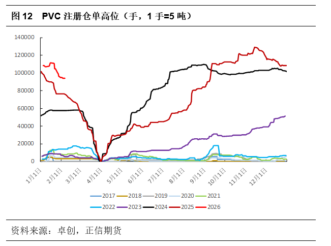3、持续累库创历史新高,短期压力可控 库存高企是当前PVC市场的核心矛盾之一,1月至今国内PVC库存呈现“持续累库”态势,截至2.5华东华南仓库库存为54.72万吨(扩充后样本库存为108.46万吨),注册仓单量同样处于高位。短期来看,行业进入季节性需求淡季,供大于求局面仍将延续,春节前后库存将延续增加态势。 不过尽管库存处于历史高位,但短期压力相对可控。一方面,春节前PVC生产企业加大预售力度,部分企业预售至节后,有效缓解了厂内库存压力;另一方面,“抢出口:行情消化了部分国内库存,一定程度上缓解了库存累积的压力,而新增的出口订单多数将于2-3月交付,届时出口量处于相对高位,导致今年春节累库幅度或低于往年。
