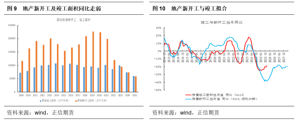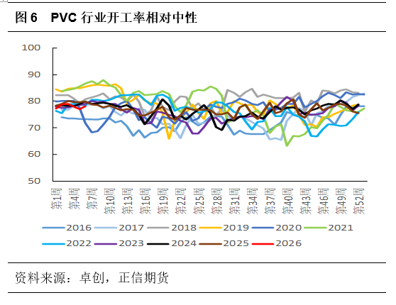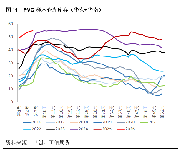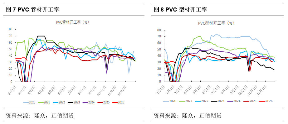 2、内需难有亮点,短期存季节性走弱预期 PVC下游终端需求中,房地产行业占比近60%,一般竣工端决定PVC当下需求,新开工决定未来需求预期,近几年新开工的持续走弱,房地产行业仍在调整阶段,改善尚需时间。 内需季节性疲软仍是当前基本面的薄弱环节,1月开始国内进入PVC传统需求淡季,北方低温天气导致工地施工进度放缓,叠加春节临近下游制品企业陆续进入休假模式,终端企业多以刚需补库为主,对高价货源的抵触情绪明显,内需对价格的支撑作用微弱。下游主要需求中硬质品如管材型材等依旧受到地产的拖累;部分软制品订单比如薄膜、地板膜虽有改善,但这部分需求占比有限,难以弥补地产端需求的疲软。