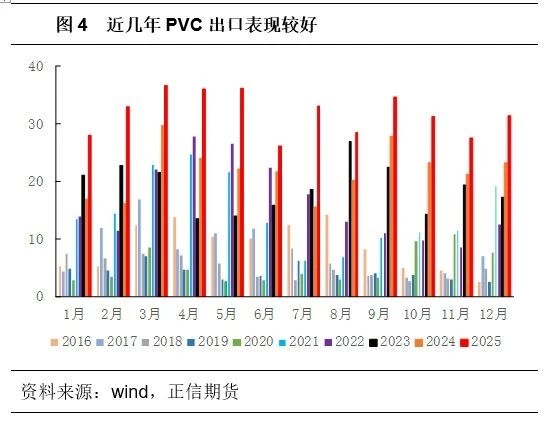 2、政策扰动,短期抢出口行情显现 今年1月政策面的意外扰动成为本次PVC反弹的重要催化剂,财政部1月9日发布公告自2026年4月1日起取消PVC出口退税(当前退税率为13%),这一政策直接触发市场短期“抢出口”行情。国内上游与贸易商企业为规避退税取消带来的成本压力,积极签订出口订单,导致1月PVC出口签单量升至近年高位。我国作为PVC净出口国,2025年全年出口382.3万吨,同比增加46.1%,出口总量占据国产量的15.7%左右,出口的短期放量缓解了国内市场的供应压力,为价格反弹提供了重要支撑,预计2026年一季度PVC出口量将继续维持环比增加态势,二季度出口则需要关注内外价差及政策影响等。