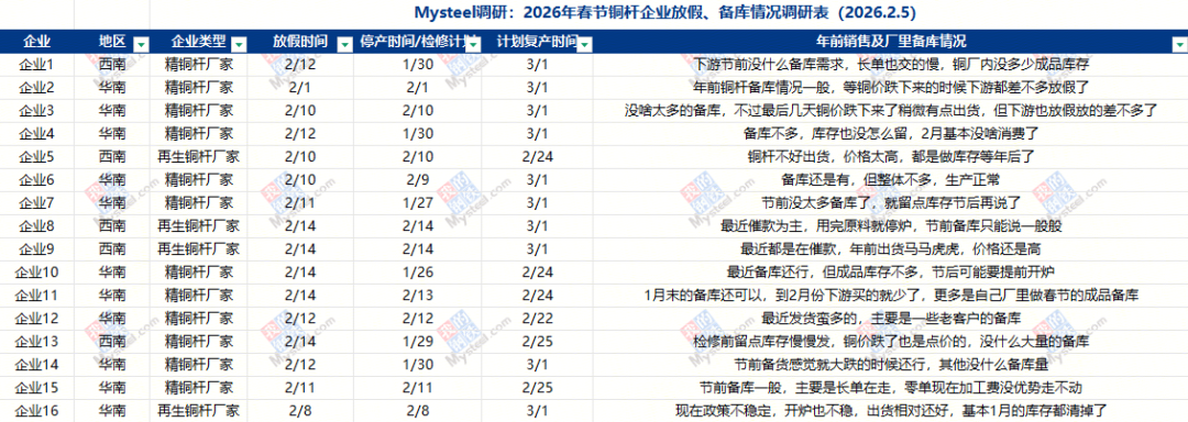 数据来源:Mysteel 铜杆企业假期期间检修、生产情况 调研的16家企业中,2026年春节假期所有铜杆企业都将提前进入停炉放假状态,没有企业选择在春节期间继续生产,其中70%的企业停炉时间在1月25日至2月10日之间,但也有30%的企业计划在2月11日至2月14日的春节前夕停炉放假;此外,计划的复产时间普遍在2月24日(正月初八)之后,甚至有一定数量的企业选择等待3月再行恢复生产。总体来看,根据Mysteel据调研厂家测算,2026年春节假期南方市场停工停产影响产量合计约11万吨,这与有一定数量企业春节后选择延后生产分不开联系。 铜杆企业节前订单、备库情况 关于消费,从订单实际反馈来看,精铜杆与再生铜杆备库表现均相较2025年春节下滑,具体情况如下: 精铜杆方面,1月末至2月初铜价波动率刷新历史,2月2日更是直线跌停,大幅回调的情况下,南方市场精铜杆企业表示承接订单有所增多,但由于在进入2月后,多数线缆企业逐步开启放假模式,年前赶工期订单也明显缩减,所以市场低位补库量也并未超出预期,多数精铜杆企业的厂内现货库存也维持在正常水平,其中,2026年精铜杆长单02合约提货量也普遍在1月下半月执行较多,2月计划提货量偏少。 再生铜杆方面,此轮铜价高波动行情下,多数专注于华南市场的再生铜杆企业表示原料采购成本及难度大增,且现货价格不合适,更多的订单还是集中在贸易商手中;但但同时,由于多数贸易商在9月-12月的行情中套利亏损较多,正能参与市场的也不太多,所以再生铜杆方面的节前交易活跃度有限,下游企业备库也更多以现货为主,整体备库表现一般。 节后市场预测 春节作为铜传统的累库时间节点,库存往往将有明显的回升,而近期国内库存又处于同期高点,铜价的波动率也在增大,节后库存去化节奏将高度依赖下游线缆企业复工速度及订单兑现情况。 从目前的调研情况来看,春节后多数南方市场的铜杆企业选择等待3月再进入生产状态,这将显著延缓节后库存去化进度。预计节后市场消费在3月3日(正月十五)之前难有明显起色,现货成交仍将维持清淡格局;其中华南市场的订单或将在元宵节后逐步释放,但西南市场受当地线缆企业复工普遍延迟的影响,需求复苏或进一步滞后至3月第二周甚至第三周以后。另外,2025-2026年来铜价的波动持续加剧,多数市场参与者对春节期间外盘的走势也愈发担忧,这也将加剧节后市场观望情绪。 七禾带你去调研,最新调研活动请扫码咨询