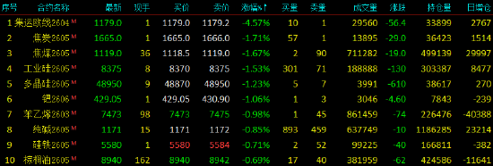 | 2026年2月10日,国内期货主力合约涨跌不一。沪锡、烧碱涨超3%,豆一、沪银、SC原油、燃料油涨超2%,低硫燃料油(LU)、PTA涨超1%;跌幅方面,集运欧线跌超4%,焦煤、焦炭、工业硅、多晶硅、苯乙烯(EB)跌超1%。