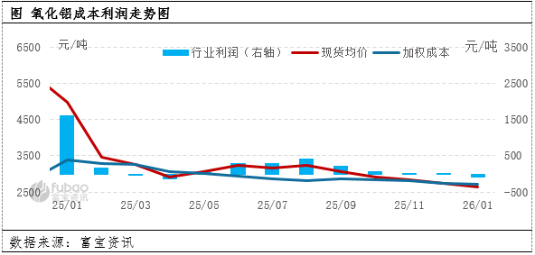 | 报告品种:氧化铝 原文链接:https://mp.weixin.qq.com/s/_dCJSE2dgk4kTB6OeGpQzA?scene=1&click_id=7 【导语】1月铝土矿、烧碱、动力煤等原料价格下跌,氧化铝企业生产成本进一步松动,但随着氧化铝现货价格下跌,国内企业亏损空间再度扩大。 富宝资讯数据监测,2026年1月国内氧化铝加权生产成本2727.94元/吨,较上月降16.16元/吨,降幅0.59%;利润均值为-89.56元/吨,较上月减少91.66元/吨,降幅4364.76%。氧化铝生产成本松动,主要在于铝土矿、动力煤、烧碱等原料价格下跌;利润方面,氧化铝企业利润处于亏损,主要在于现货供应依然充足,现货价格下跌。