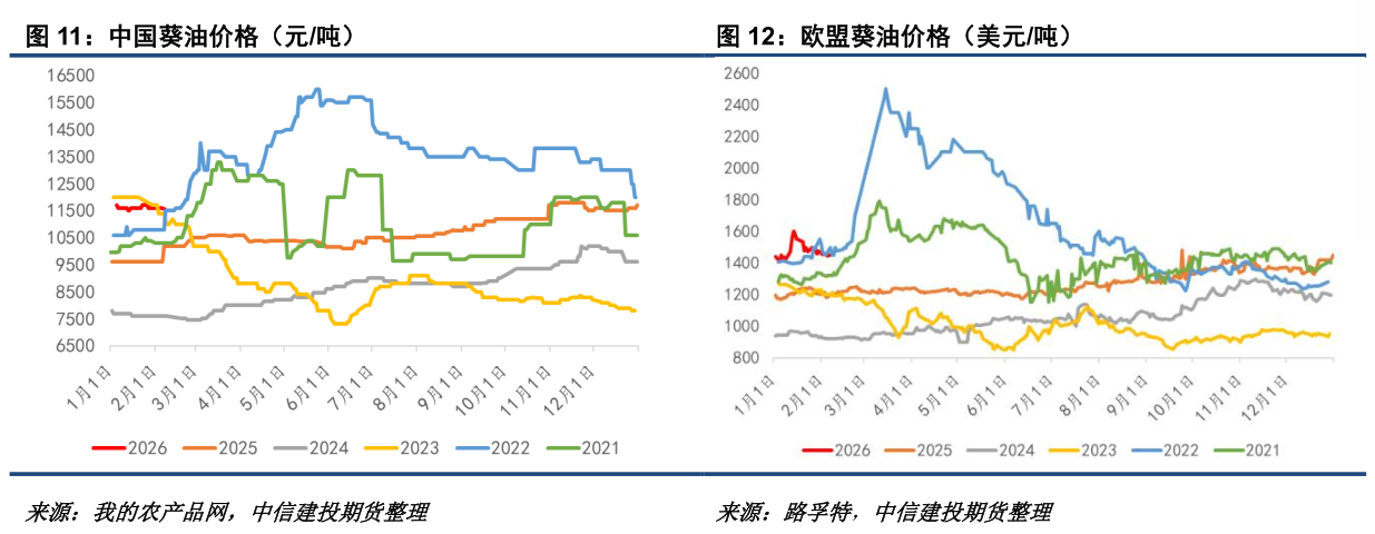 俄罗斯能卖多少葵油到中国? 我们此前曾预测25/26年度中国葵油进口数量有望恢复至100万吨以上,但目前25/26年度前三个月累计进口仅14.5万吨,若要达到100万吨的总目标,26年1-9月月均进口需达到9.5万吨。按照俄罗斯葵油进口占比50%估计,则俄葵油需每月对华出口近5万吨。目前来看实现这一目标有一定压力,因为中国葵油CNF报价长期在1300美元/吨左右,而印度则在1400美元/吨,差距较大。对于俄罗斯而言,其月度葵油产出和出口约17-18万吨,而印度月均葵油进口15-35万吨之间,理论上已经能独立消化俄罗斯的葵油供应。对中国而言,可能需要期待中欧班列补贴额度的重新发放吸引更多俄罗斯葵油回流中国。