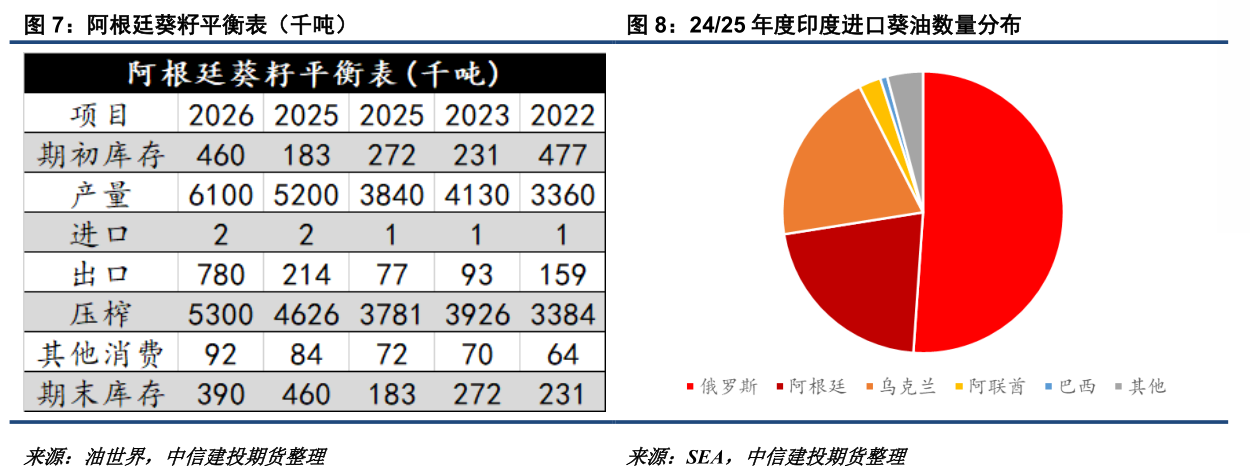 阿根廷葵油或与俄罗斯竞争印度市场 若俄罗斯葵油对印度出口受到冲击,中国葵油进口迎来转机的概率较大。目前来看传统葵油产区俄罗斯、乌克兰受减产影响,在国际市场的份额或受阿根廷冲击。2026年阿根廷葵籽产量有望达到6100万吨,为近年来最好水平。按照5300万吨的葵花籽压榨预估,阿根廷本年度葵油产出在225万吨左右,虽然仍不及俄乌,但已经是边际上的最大供应增量。我们预计阿根廷葵油将首先与俄罗斯竞争印度市场,并在26年二季度开始影响力逐步提升,因其新季上量有望增多,而俄罗斯葵油旧作将越卖越少。24/25年度,印度累计进口阿根廷葵油61.6万吨,占比21%左右,少于俄罗斯但多于乌克兰。25/26年度,乌克兰葵籽产出进一步被压缩,预计阿根廷将逐步取代乌克兰在欧盟以外市场的供应地位,并成为俄罗斯在印度市场的挑战者。