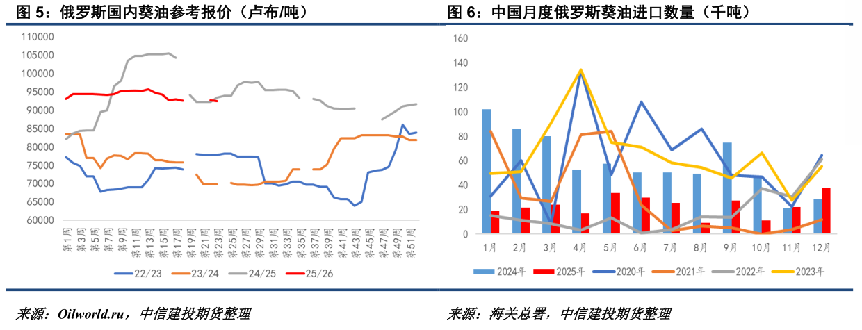俄罗斯抬升葵油出口税,出口潜力下滑 俄罗斯葵油对华出口的减少,是本年度中国葵油供应收紧的关键因素。25/26作物年度,俄罗斯葵油出口指导价从1130.6美元/吨抬升到目前的1233.3美元/吨,出口关税已经接近9500卢布/吨。按照10/9的中国作物年度,25/26年前3个月中国累计进口俄罗斯葵油7.1万吨,同比下降约2.5万吨,远不及23/24年度同期的15万吨水平。在俄罗斯葵油可供出口潜力进一步下降的背景下,中国较难通过俄罗斯单一来源地获得足够的葵油补充。