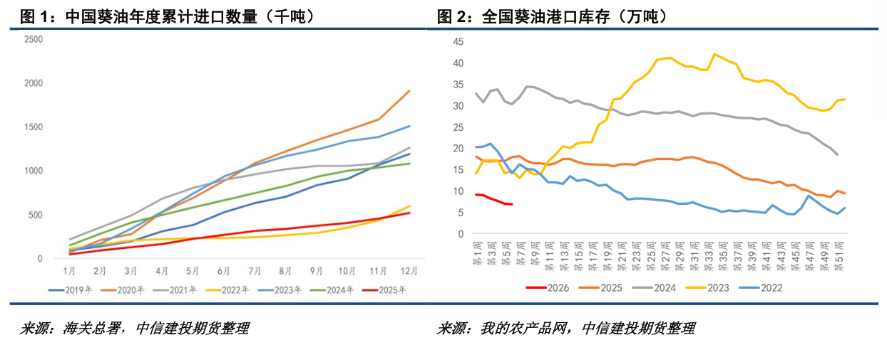 | 25/26作物年度,全球葵籽产量恢复严重不达预期,约5700万吨,同比几乎持平。叠加黑海地缘冲突冲击,全球葵油供应结构性偏紧运行,中国进口亦同比下滑。目前,中国沿海港口葵油样本库存不到7万吨,为近年来同期最低水平。展望后市,市场潜在的关注方向在于中国葵油库存的回升潜力及实现路径,以及较低的库存水平能否刺激国内价格明显上涨。 葵油进口下滑,库存来到较低水平 2025年中国葵油总进口数量仅52.4万吨,同比下降52%左右,其中俄罗斯占比53%,其次为哈萨克斯坦(占比28%)和乌克兰(占比13%)。结构上来看俄罗斯仍占据最大份额,而哈萨克斯坦增长较快。虽然中国葵油进口下降可从全球葵籽减产角度进行解释,但FAS预计25/26和24/25年度全球葵油总出口为1131.4和1192万吨,同比分别下降5%、14%左右,均远不及中国的52%。我们倾向于中国葵油进口的下滑,应从葵籽减产、地缘事件扰乱进口供应量、俄罗斯葵油出口税调整及中国需求承压等多方面进行讨论。但无论原因如何,目前中国沿海港口葵油库存已呈现超半年的去库趋势,库存从8月初的17.9万吨下降到目前的6.9万吨。若按照目前趋势,沿海葵油库存将逐步消耗殆尽。